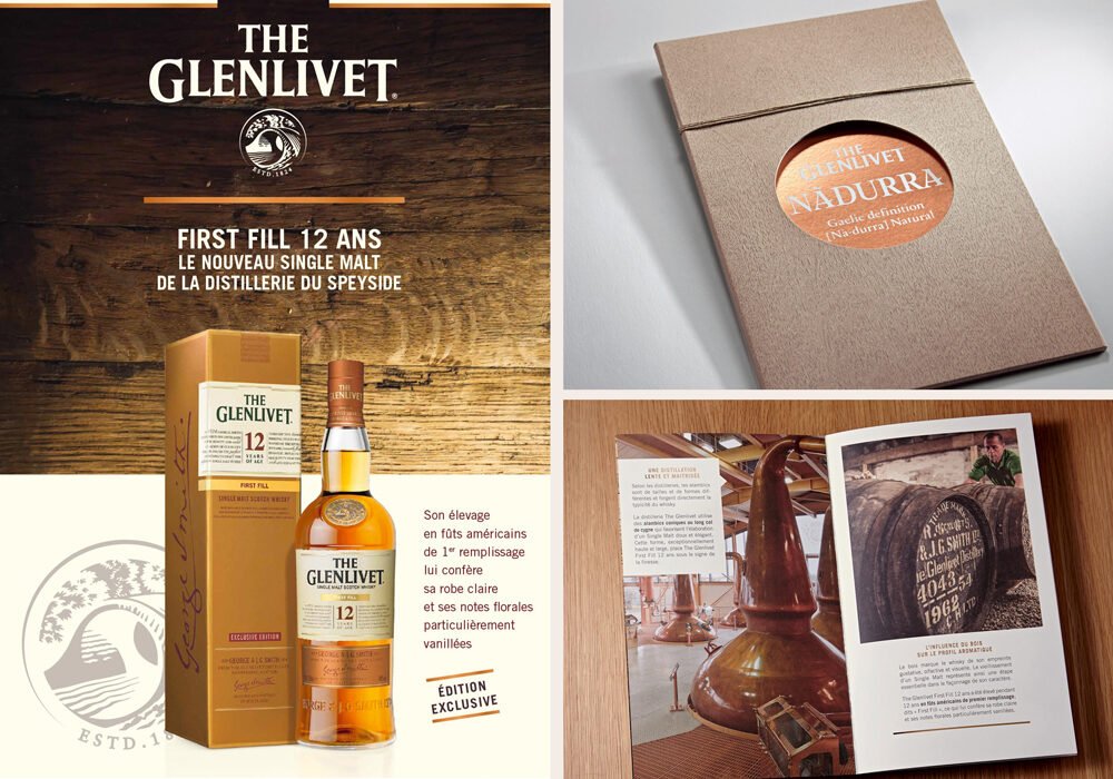 Pour The Glenlivet, j’ai conçu un leaflet, un dossier de presse et une affiche destinés aux journalistes et cavistes lors du lancement de nouvelles bouteilles.